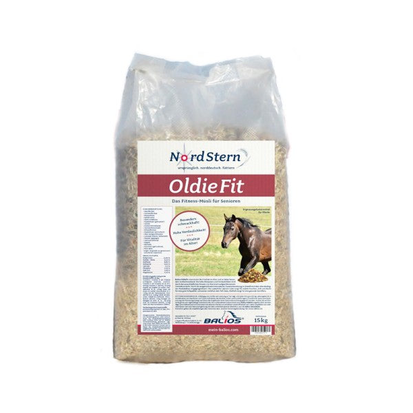 BALIOS Oldie-Fit ist ein Müsli für alte Pferde, das einen hohen Anteil an essentiellen Aminosäuren aufweist und einem altersbedingten Muskelabbau entgegensteuern kann. Die zusätzlichen Zugaben von Calcium, Zink, Biotin und Leinsamen sind bekannt für ihre positive Wirkung auf Knochen, Immunsystem, Hufqualität und den Verdauungstrakt. Für Senioren mit Kau- und Zahnproblemen kann das Futter auch mit Wasser eingeweicht werden. Die in dem Müsli enthaltene Getreidemischung aus Mais- und Gerstenflocken, Sojabohnen, Haferschälkleien, Gerste, Erbsenflocken, Karotten und Rote Bete wird von Pferden sehr gerne angenommen und hält Oldies in ihren "goldenen Jahren" fit und vital.