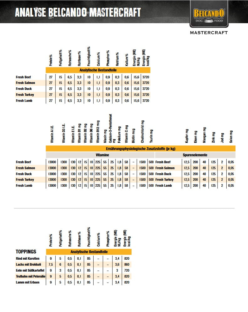 Analytische Bestandteile Protein 25 %; Fettgehalt 14,5 %; Rohasche 7 %; Rohfaser 3,2 %; Feuchtigkeit 10 %; Calcium 1,3 %; Phosphor 0,9 %; Natrium 0,3 %
