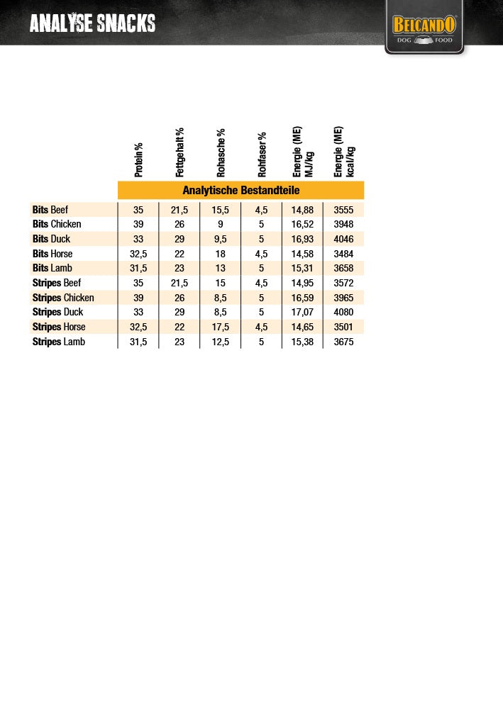 Analytische Bestandteile Protein 19,5 %; Fettgehalt 9 %; Rohasche 6,5 %; Rohfaser 5 %; Feuchtigkeit 10 %; Calcium 0,9 %; Phosphor 0,65 %; Natrium 0,2 %