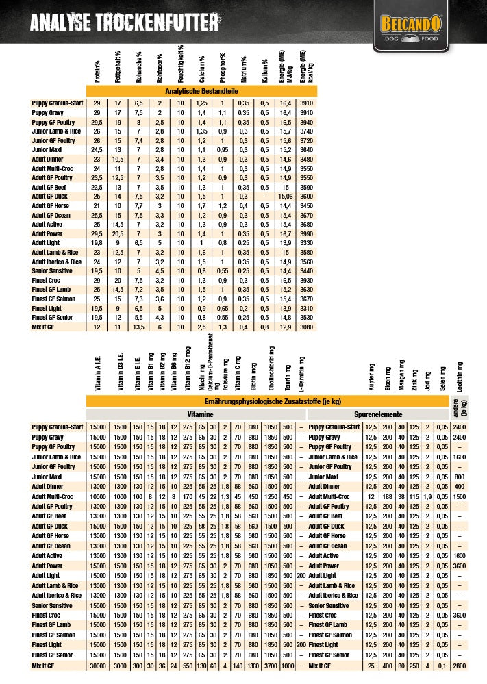 Anteil tierisches Eiweiß am Gesamteiweiß: 80 % (Lamm 35 %, Geflügel 25 %, Fisch 10 %, Gelatine 10 %)