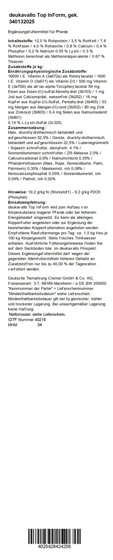 Je nach Produktionswerk, Jahreszeit, Warenverfügbarkeit u. a. können leichte Veränderung der Zusammensetzungen möglich sein. Die konkreten Inhaltstoffe des Futters entnehmen Sie bitte der Deklaration auf jedem Futtersack oder in der Bildgalerie auf dieser Seite.