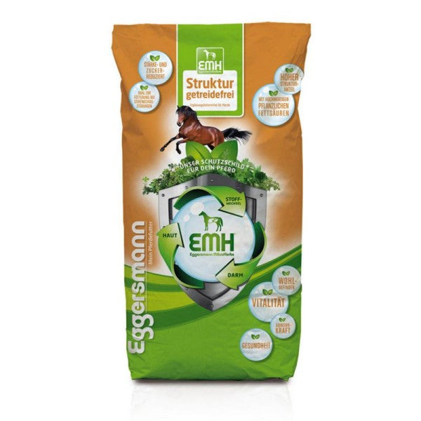 Eggersmann Struktur getreidefrei ist ein getreidefreies Futter für eine naturnahe und artgerechte Fütterung. Aufgrund seiner stärke- und zuckerarmen Komposition, die reich an hochverdaulichen Raufasern ist, kann es den Stoffwechsel entlasten und einen gesunden Magen-Darm-Trakt fördern. Daher eignet es sich für empfindliche oder stoffwechselerkrankte Pferde.
