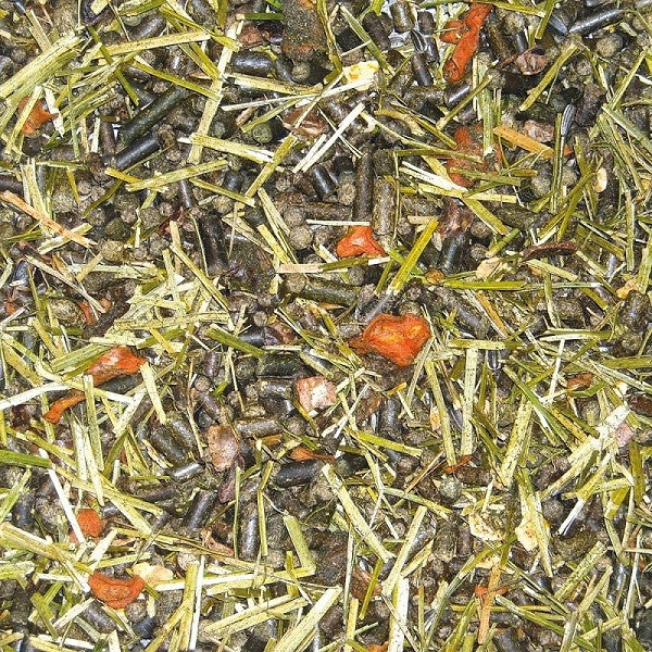 Luzernegrünmehl 49,9 %, Obst (Apfel)Trester getr. 14,0 %, Luzerne getrocknet (Heu) 8,1 %, Leinextraktionsschrot 5,1 %, Sonnenblumenextraktionsschrot 4,0 %, Lignocellulose 3,3 %, Johannisbrot, zerkleinert 3,0 %, Reisschalenkleie 2,6 %, Sonnenblumenkerne 2,3 %, Möhren (getrocknet) 1,7 %, Mariendistelöl 1,7 %, Rübenmelasse 1,5 %, Calciumcarbonat 1,0%, fermentierter Pflanzenauszug (EMH) 0,6 %, Natriumchlorid 0,5 %, Mariendistelkraut 0,1 %, Löwenzahn 0,1 %, Weißdornblätter 0,1 %, Artischocke 0,1 %, Gingkoblätter 0,1 %