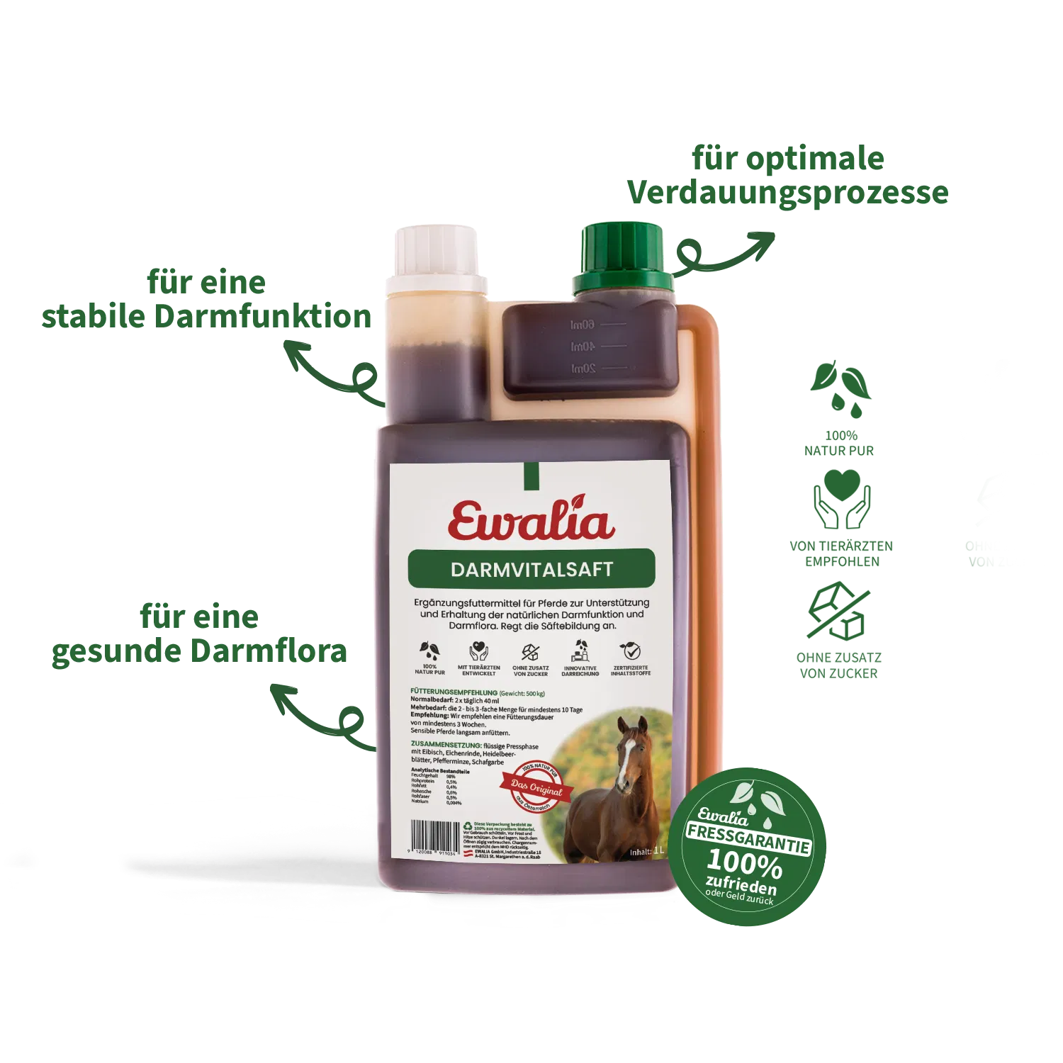 Der EWALIA Darmvitalsaft unterstützt die Erhaltung und Stabilisierung der natürlichen Prozesse im Darm. Für eine optimale Darmfunktion und Darmflora. Speziell enthaltene Kräuter in Arzneibuchqualität unterstützen eine gesunde Darmschleimhaut, helfen die Darmflora zu stabilisieren und können so Blähungen und Kotwasser auf natürliche Weise entgegenwirken. Die enthaltene Pfefferminze wirkt zudem wohltuend auf den Verdauungstrakt.