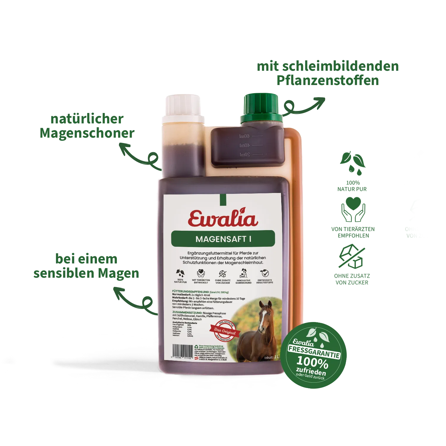 Der EWALIA Magensaft I unterstützt die körpereigenen Magen-Darmfunktionen mit schleimbildenden Pflanzenstoffen wie dem Eibisch und fördert somit eine gesunde Magenschleimhaut. Mit Magen regulierenden Kräutern in Arzneibuchqualität ist er eine Wohltat für sensible Pferde.