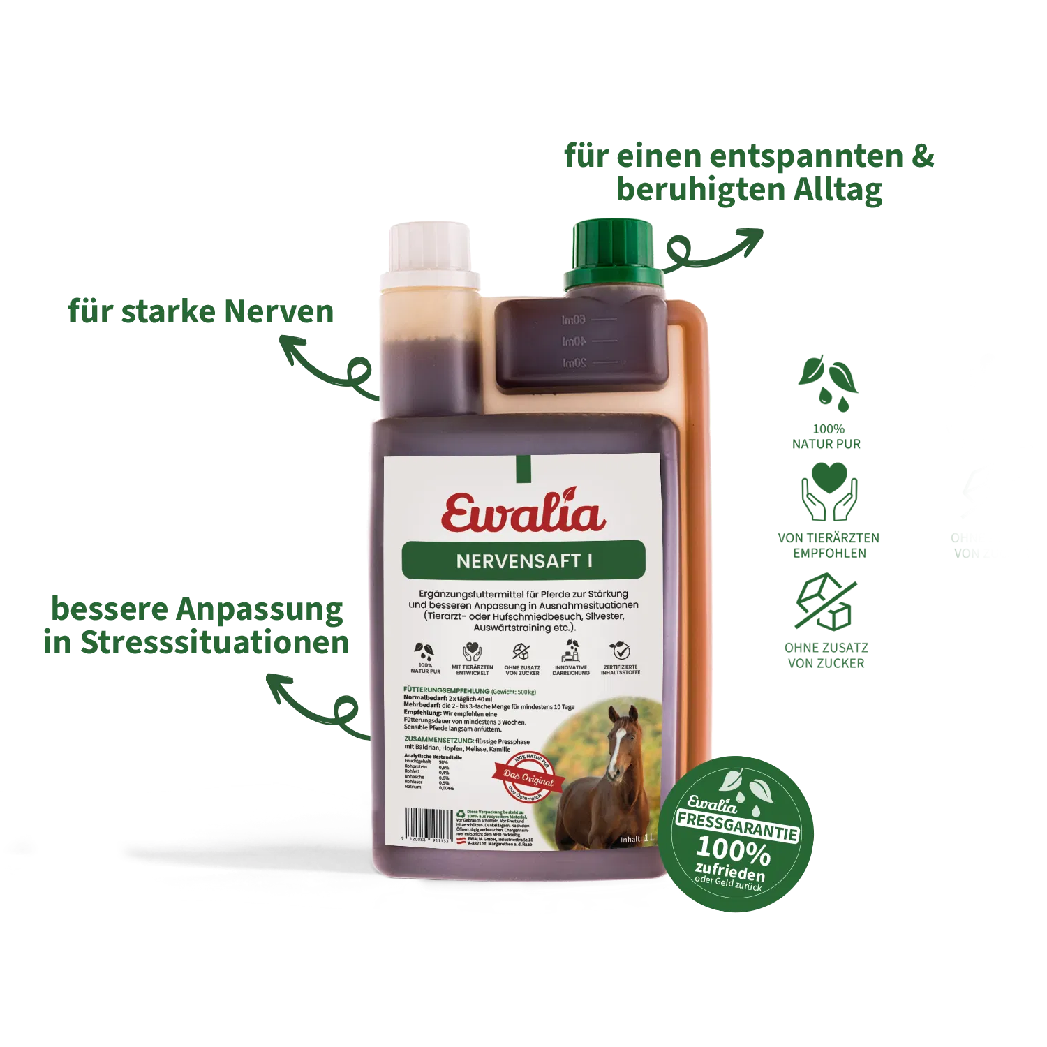 Der EWALIA Nervensaft I trägt auf natürliche Weise zu starken Nerven im Alltag bei und unterstützt eine bessere Anpassung an Ausnahmesituationen (Tierarzt- oder Hufschmiedbesuch, Silvester, Auswärtstraining, Boxenruhe etc.). Er enthält eine einzigartige Mischung an Kräutern, die für ihre harmonisierenden und beruhigenden Eigenschaften bekannt sind.