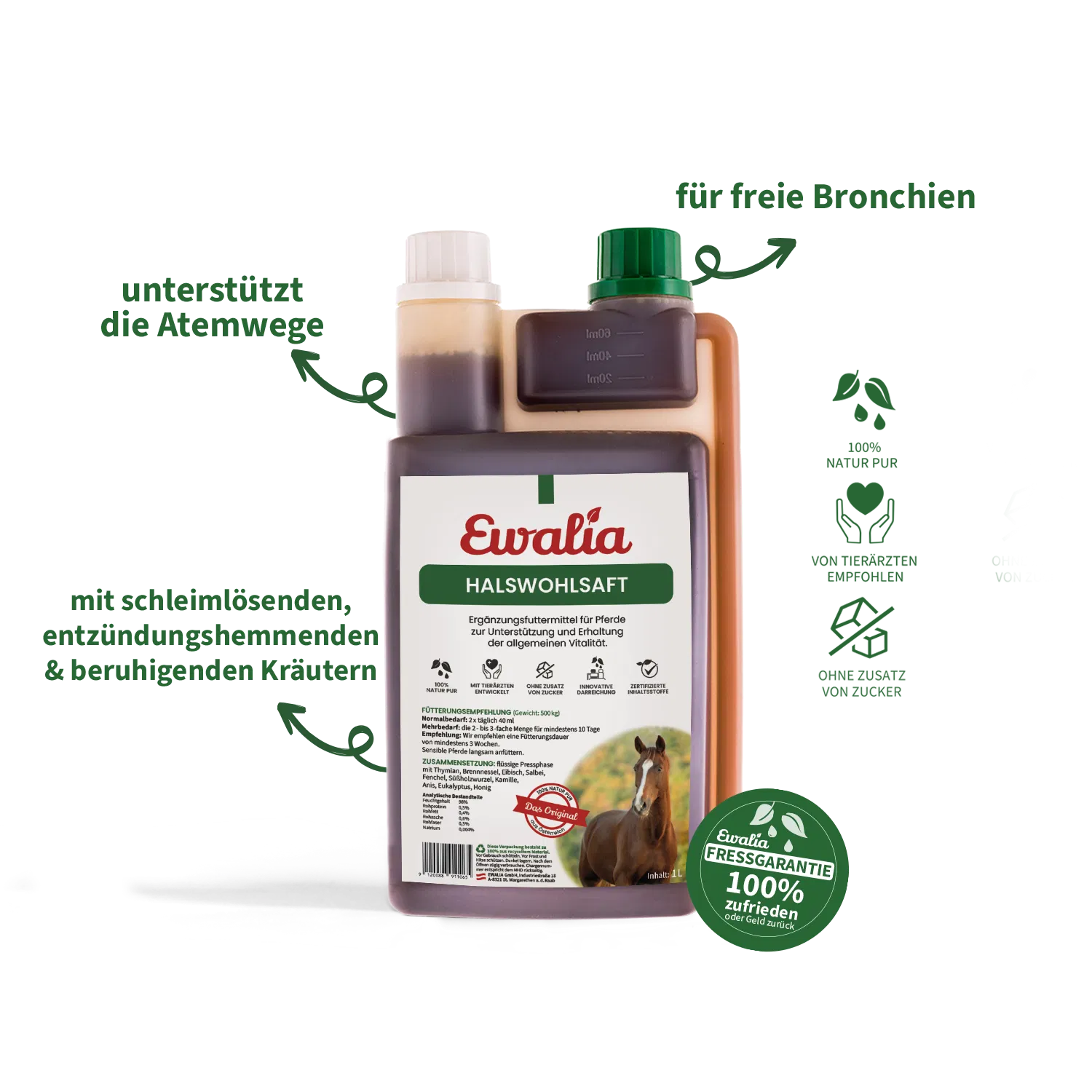 Der EWALIA Halswohlsaft unterstützt dein Pferd auf natürliche Weise mit einer ausgewogenen Mischung aus Kräutern in Arzneibuchqualität. Diese besonderen Atemwegskräuter sind bekannt für ihre schleimlösenden, entzündungshemmenden, bronchienerweiternden und Abwehr stärkenden Eigenschaften und begünstigen freie Atemwege.