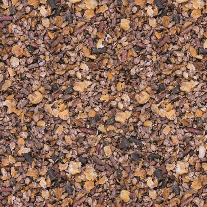 Gerstenflocken, Maisflocken, Weizenkleie, Luzernegrünmehl, Dinkelspelzen, Weizen, Gerste, Rübenmelasse, Erbsenflocken, Leinöl, Weizen gepufft, Calciumcarbonat, Biertreber, Luzerneheu, Mais gepufft, Bierhefe 1,5 %, Karotten, getrocknet, Monocalciumphosphat, Natriumchlorid