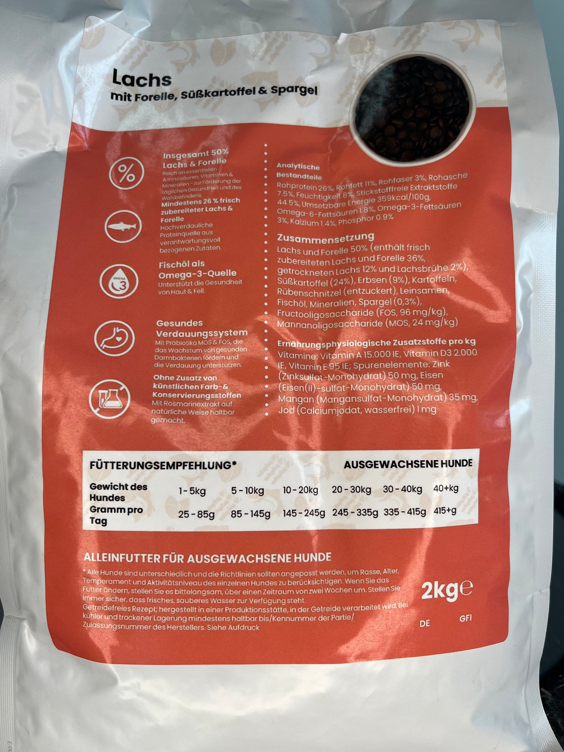 Lachs und Forelle 50% (enthält frisch zubereiteten Lachs und Forelle 36%, getrockneten Lachs 12% und Lachsbrühe 2%), Süßkartoffel (24%), Erbsen (9%), Kartoffeln, Rübenschnitzel (entzuckert), Leinsamen, Fischöl, Mineralien, Spargel (0,3%), Fructooligosaccharid (FOS, 96 mg/kg), Mannanoligosaccharid (MOS, 24 mg/kg)