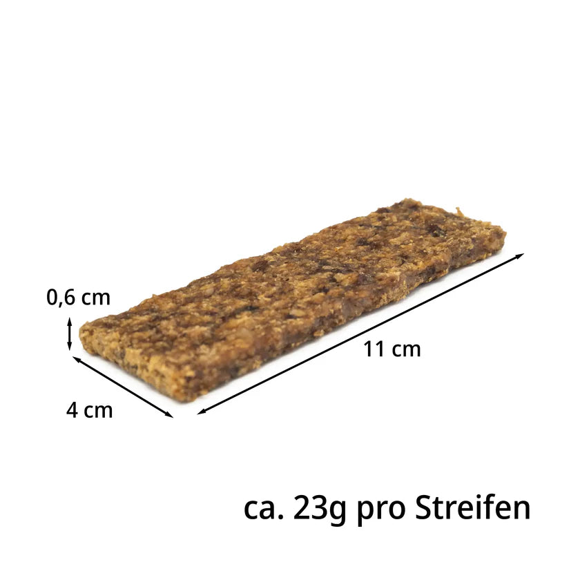 Das Fleisch stammt aus europäischer Herkunft, wird schonend luftgetrocknet und ist frei von künstlichen Zusätzen wie Farb-, Aroma- oder Konservierungsstoffen. Dank des intensiven Fleischaromas, der mittelharten Konsistenz und der handlichen Form sind die Streifen sowohl als Snack für zwischendurch als auch als Belohnung beim Training hervorragend geeignet.