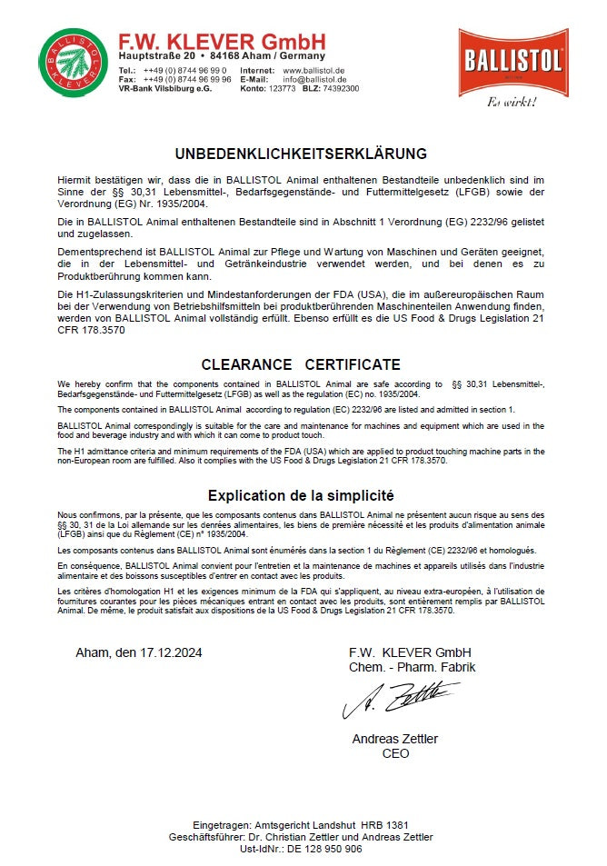 Wirkt desinfizierend: BALLISTOL Animal ist keimfrei, wirkt desinfizierend und ist bei versehentlicher Einnahme (Abschlecken des Fells) völlig unbedenklich.