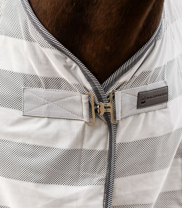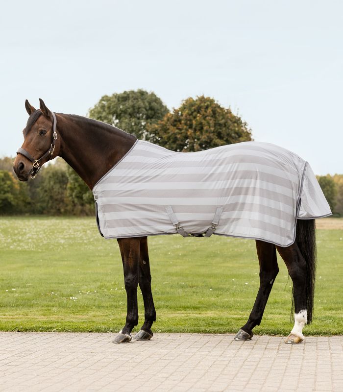 Klassische Fliegendecke, die effektiv vor störenden Insekten schützt. Sie ist mit abnehmbaren, verstellbaren Kreuzgurten ausgestattet, die eine präzise Anpassung an das Pferd ermöglichen. Zudem verfügt sie über einen Schweiflatz, eine tiefe Hinterhandkordel und einem Klettverschluss unter einem praktischen T-Verschluss.